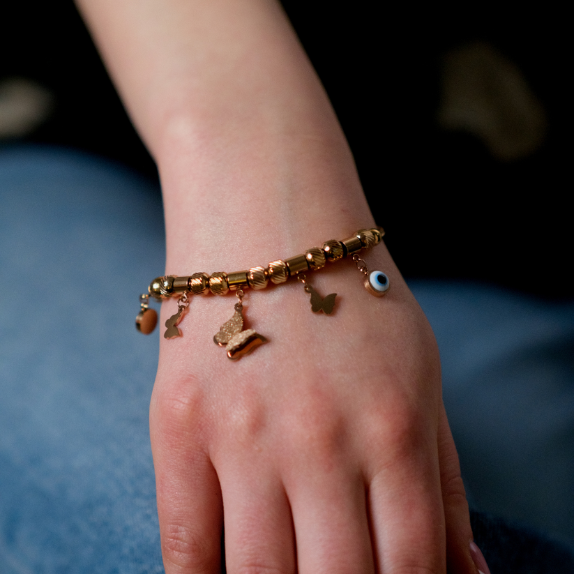 Each charm on the bracelet is a tribute to the creatures that share our planet, from the delicate flutter of butterfly wings to the watchful gaze of the evil eye.