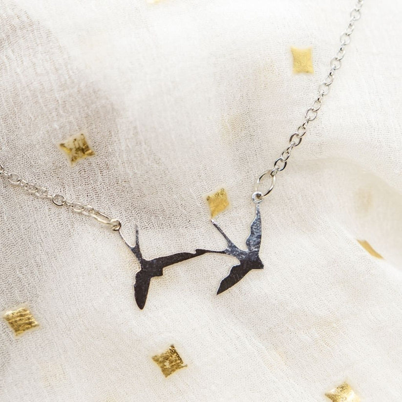 The pendant features two delicately crafted nature birds in flight, symbolising freedom, grace, and the beauty of the natural world.
