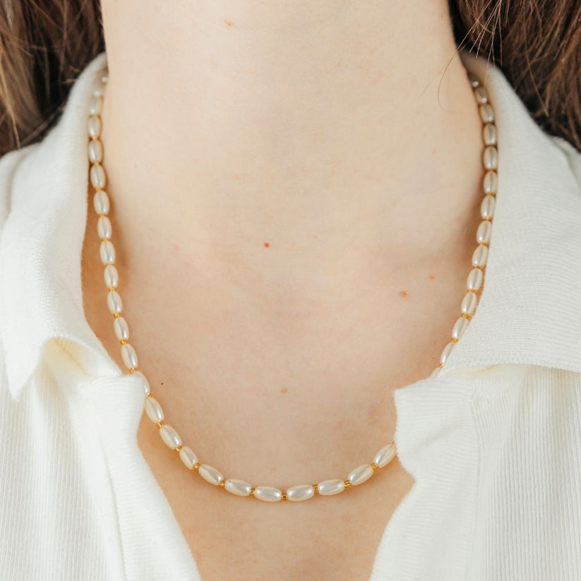 Introducing our Small White Oval Freshwater Pearl Necklace, a timeless accessory that effortlessly combines sophistication with versatility.