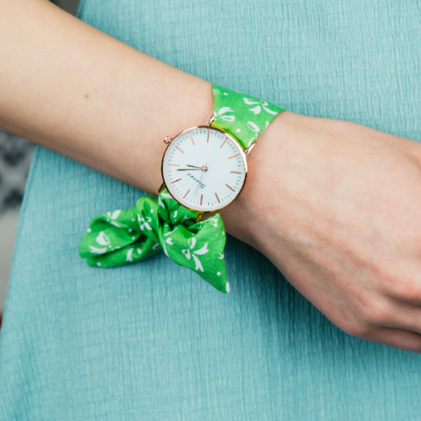 Starting with the perfect winter accessory – the Green Floral Print Changeable Fabric Strap Tie Knot Women's Wristwatch.