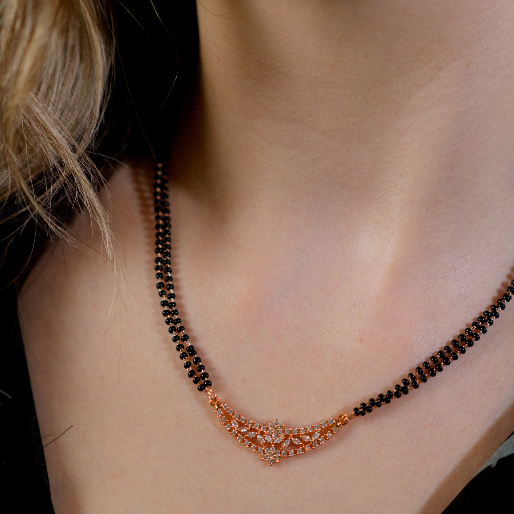The elegant rose gold color, combined with sparkling zircon and classic black beads, creates a stunning contrast that catches the eye.