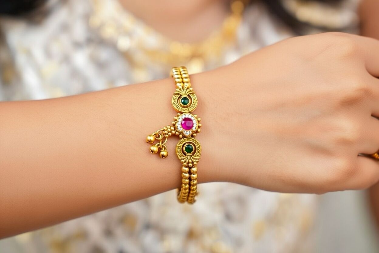 Celebrate tradition with our Traditional Brass Bracelet with Pink Stone Centerpiece, designed with a dual-layer bead chain and exquisite detailing. The centerpiece showcases a vibrant pink stone complemented by green accents, adding charm and sophistication. Perfect for pairing with ethnic outfits at weddings, festivities, and cultural events.